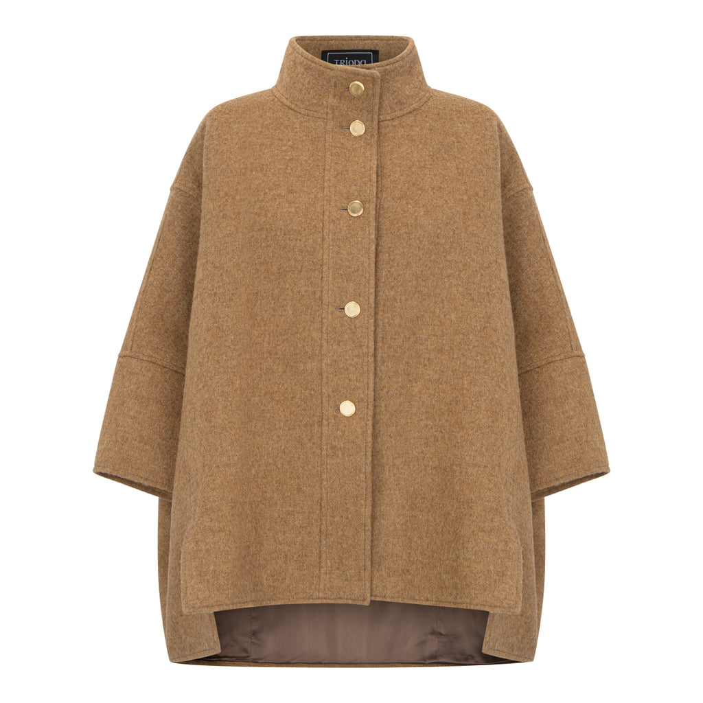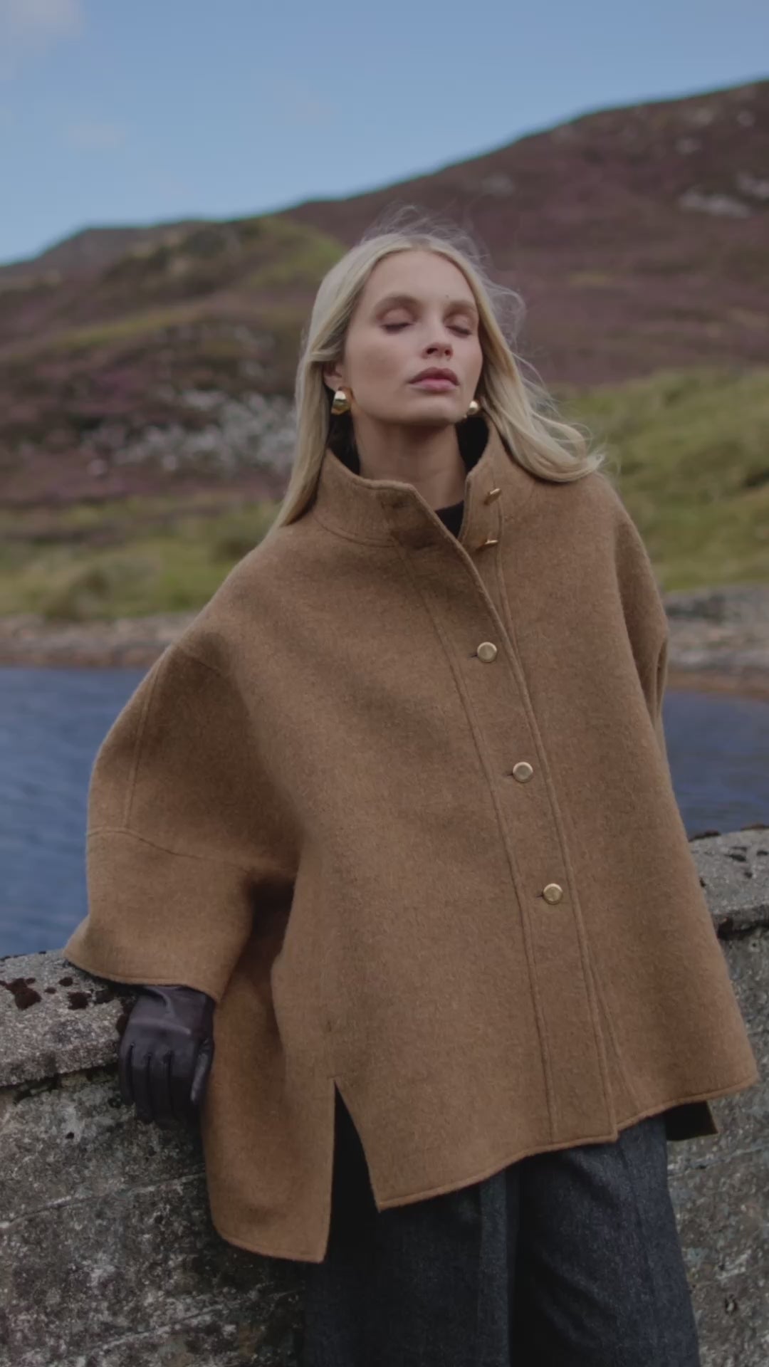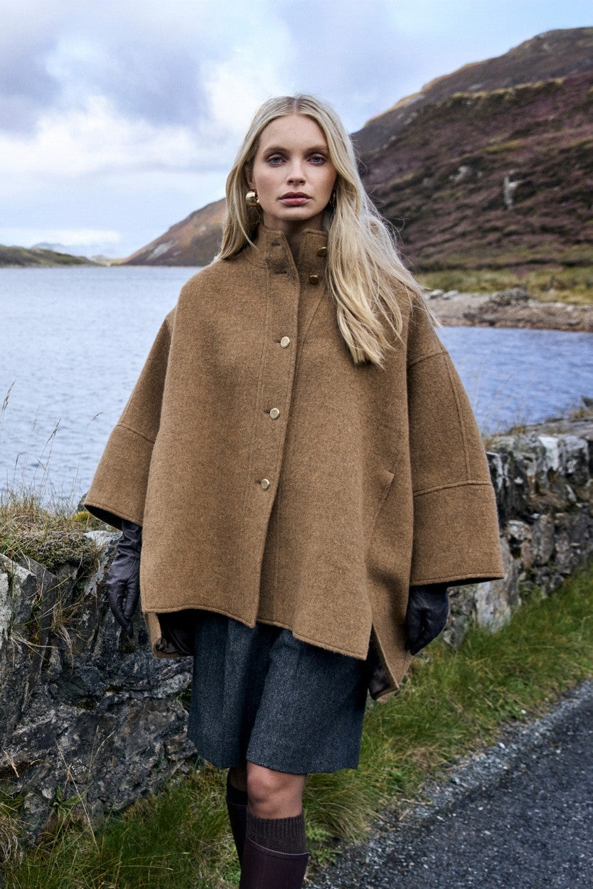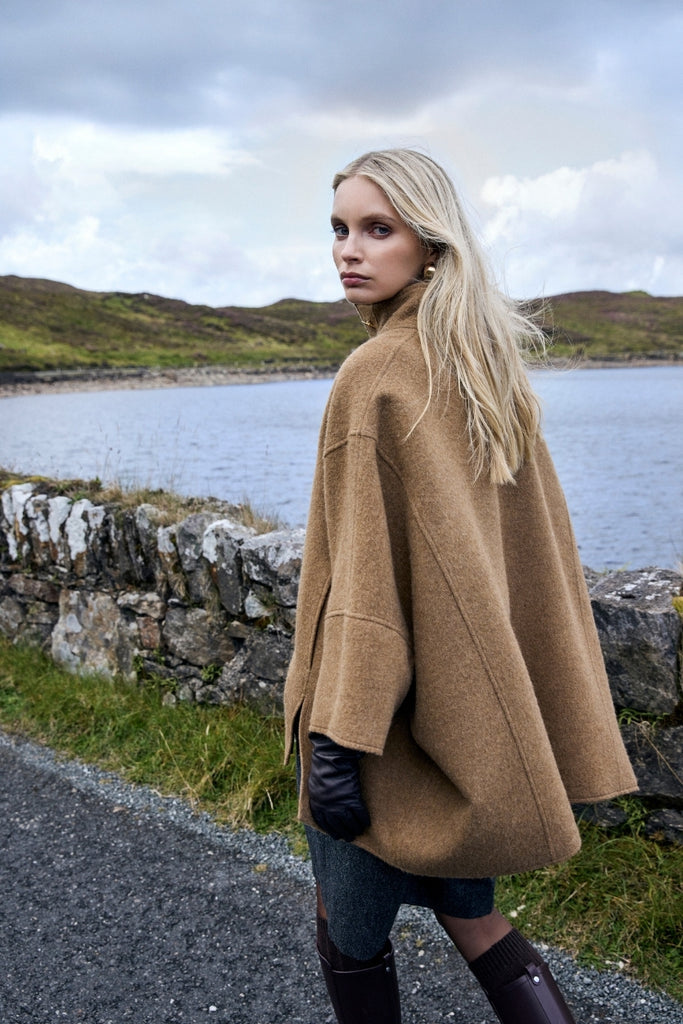 In a classic camel hue, the Tracey Cape is crafted from brushed merino wool, offering a soft, luxurious feel and beautiful drape. The stand collar adds a refined edge, framing the neckline with a minimalist structure, while the button closure keeps the silhouette clean and effortless.