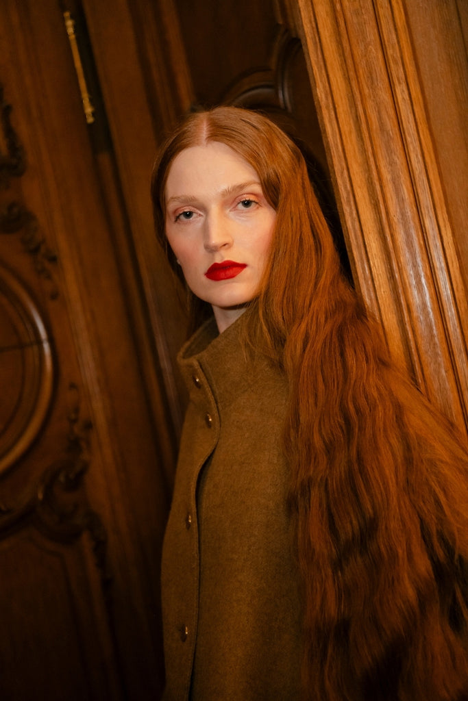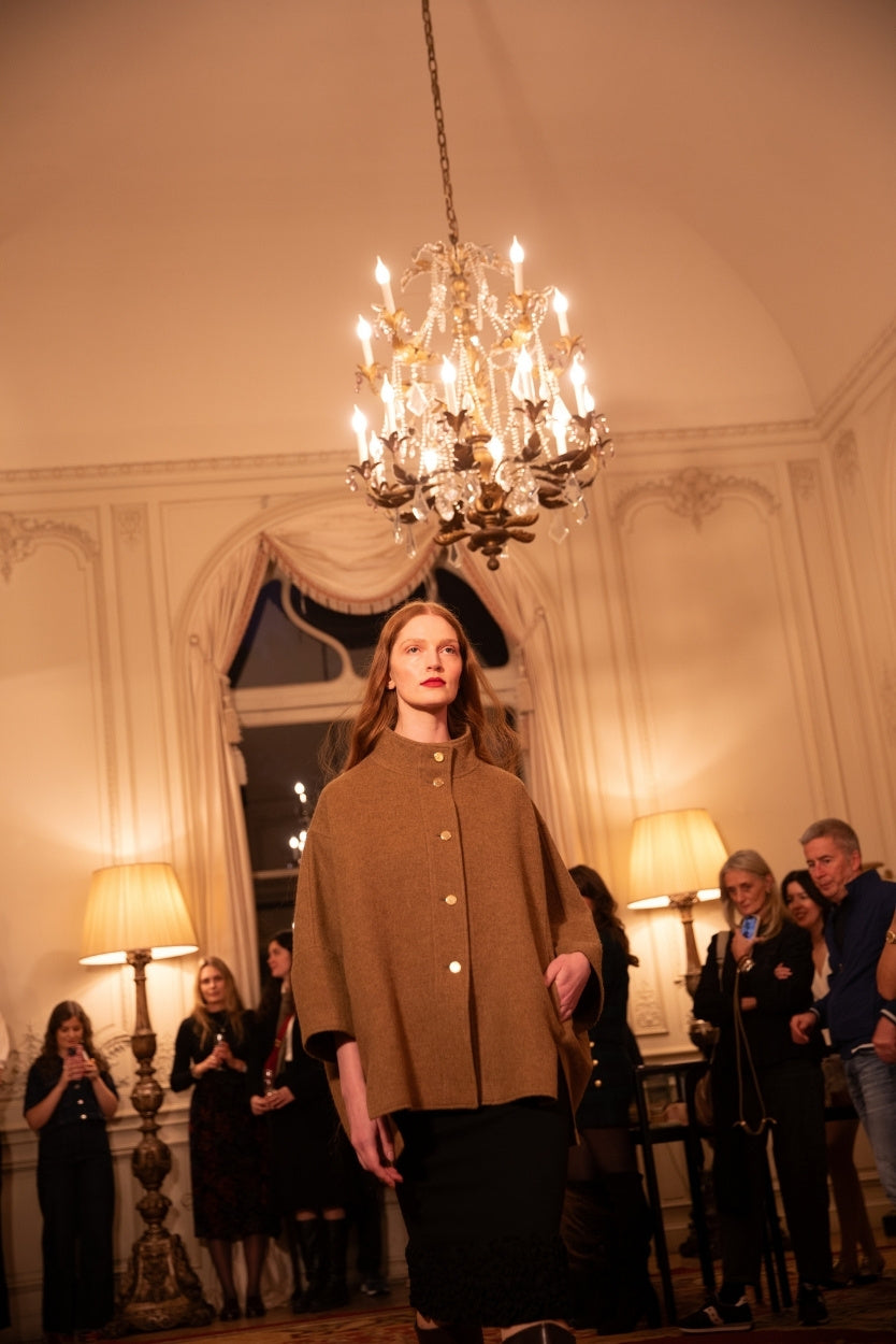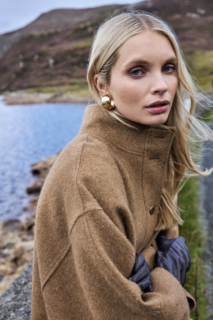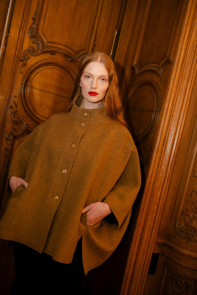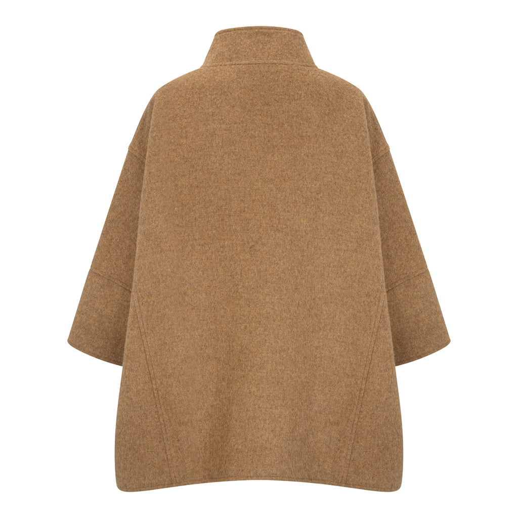 In a classic camel hue, the Tracey Cape is crafted from brushed merino wool, offering a soft, luxurious feel and beautiful drape. The stand collar adds a refined edge, framing the neckline with a minimalist structure, while the button closure keeps the silhouette clean and effortless.
