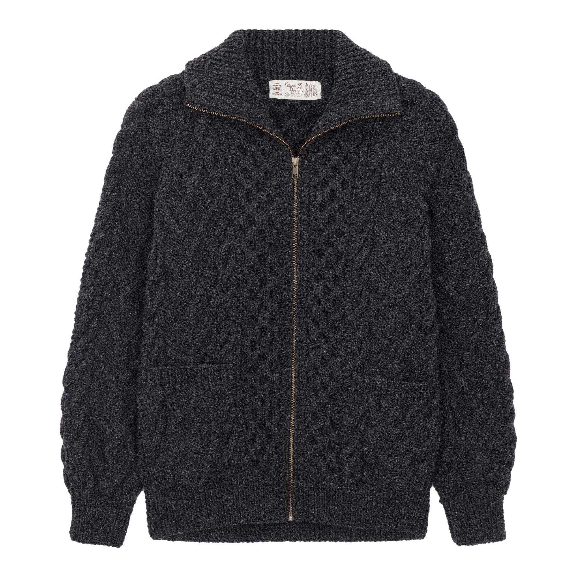 This traditional Irish zip sweater features intricate Aran patterns that pay homage to its rich heritage. This classic charcoal colour is a traditional staple. Ribbed detailing on the hem, neckline, and cuffs enhances its comfort and durability.