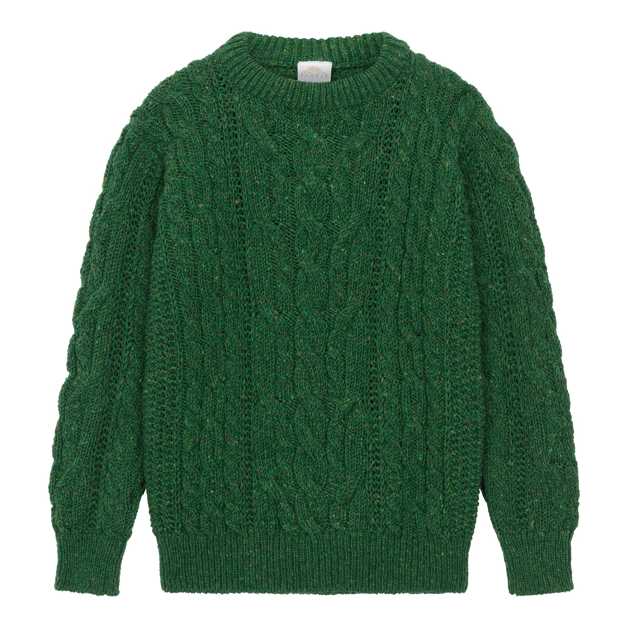 Green Fleck Unisex Cable Crew Neck Aran Sweater