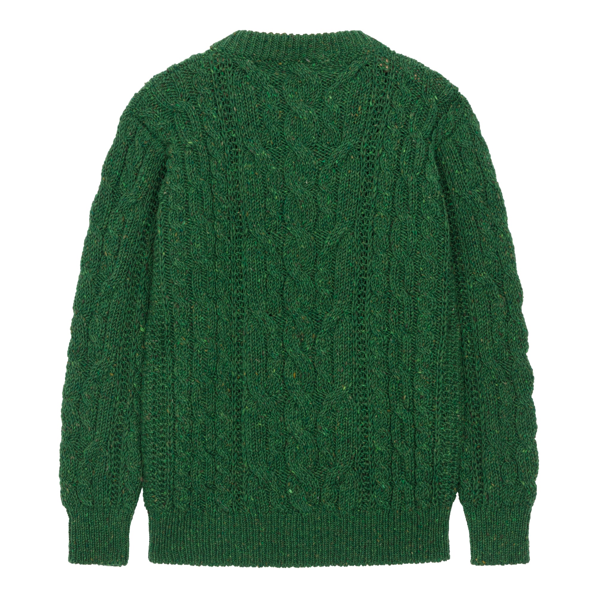 Crafted in Ardara, Co. Donegal, from 100% wool, this sweater features intricate Aran patterns that pay homage to its rich heritage. The eye catching green colour with subtle flecks running through it ensure that this sweater is a modern yet timeless design. Ribbed detailing on the hem, neckline, and cuffs enhances its comfort and durability.