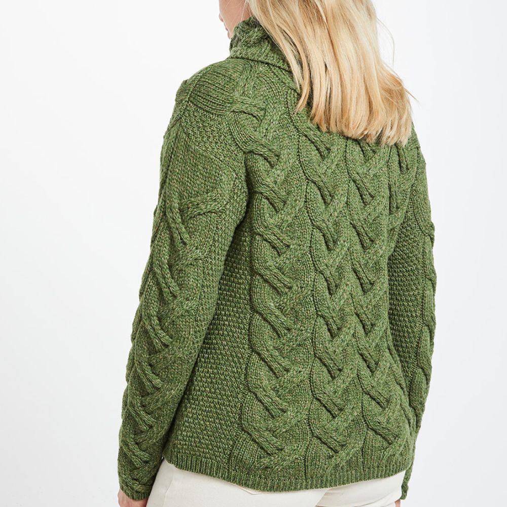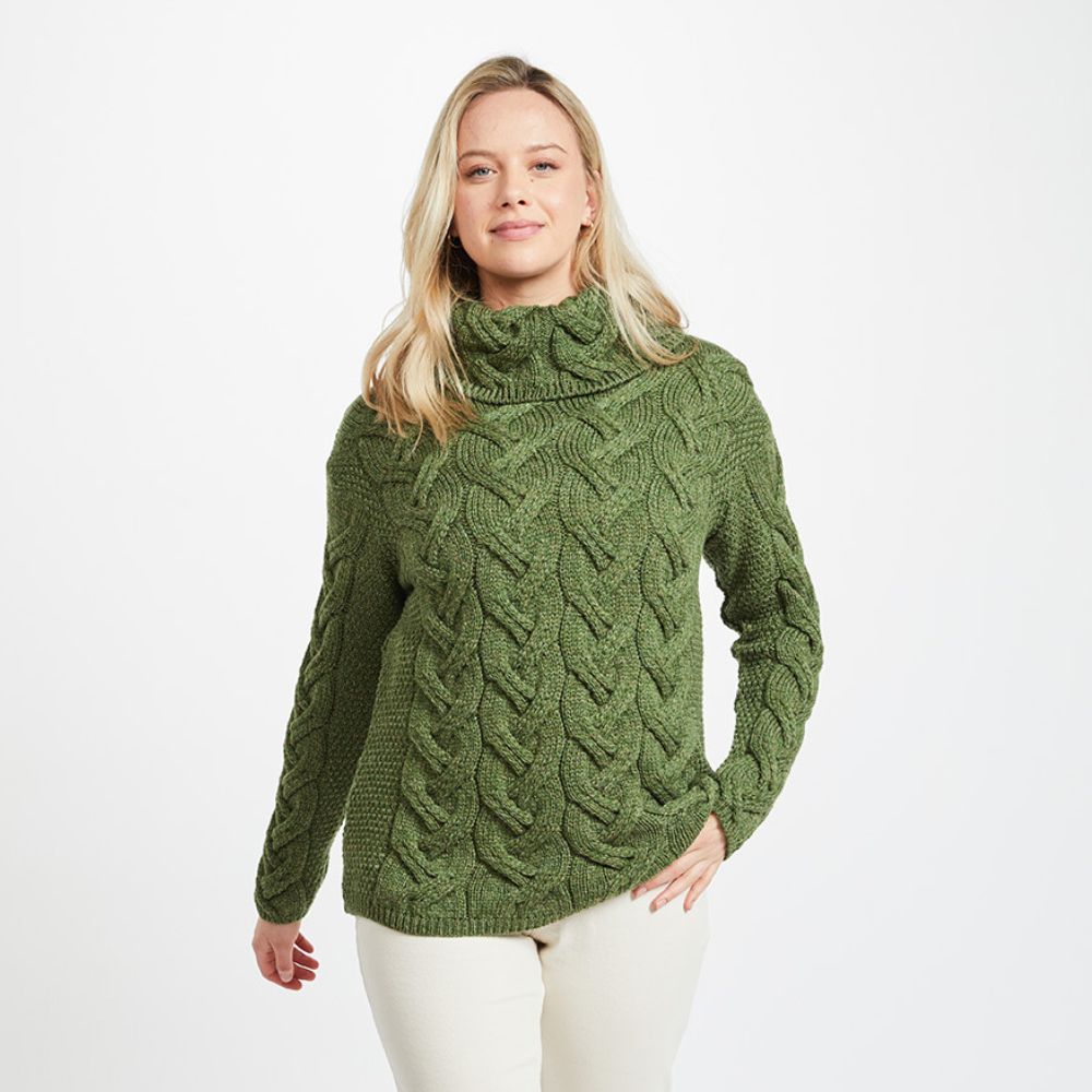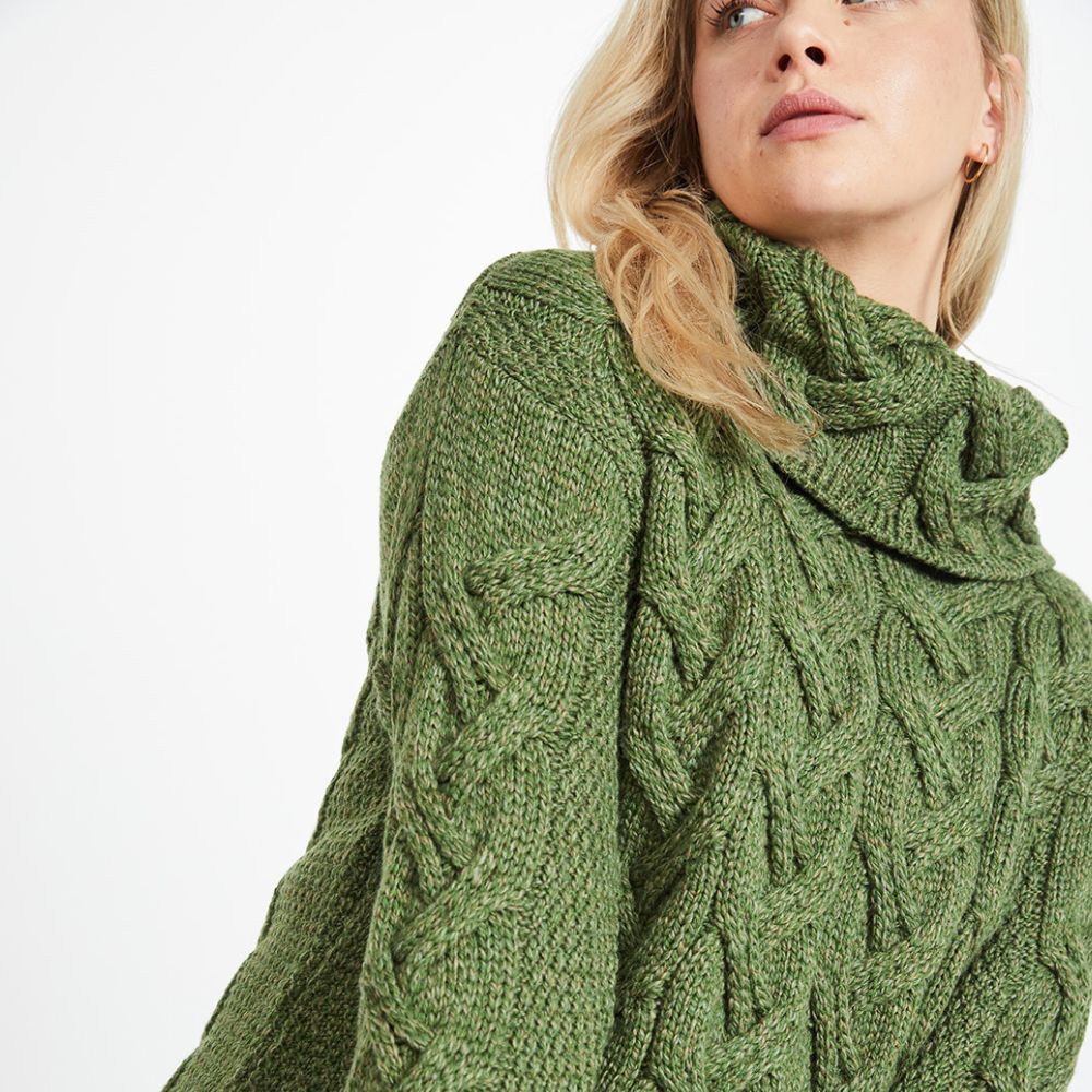 This polo neck sweater, featuring traditional Aran stitches, is a striking and versatile addition to any wardrobe.