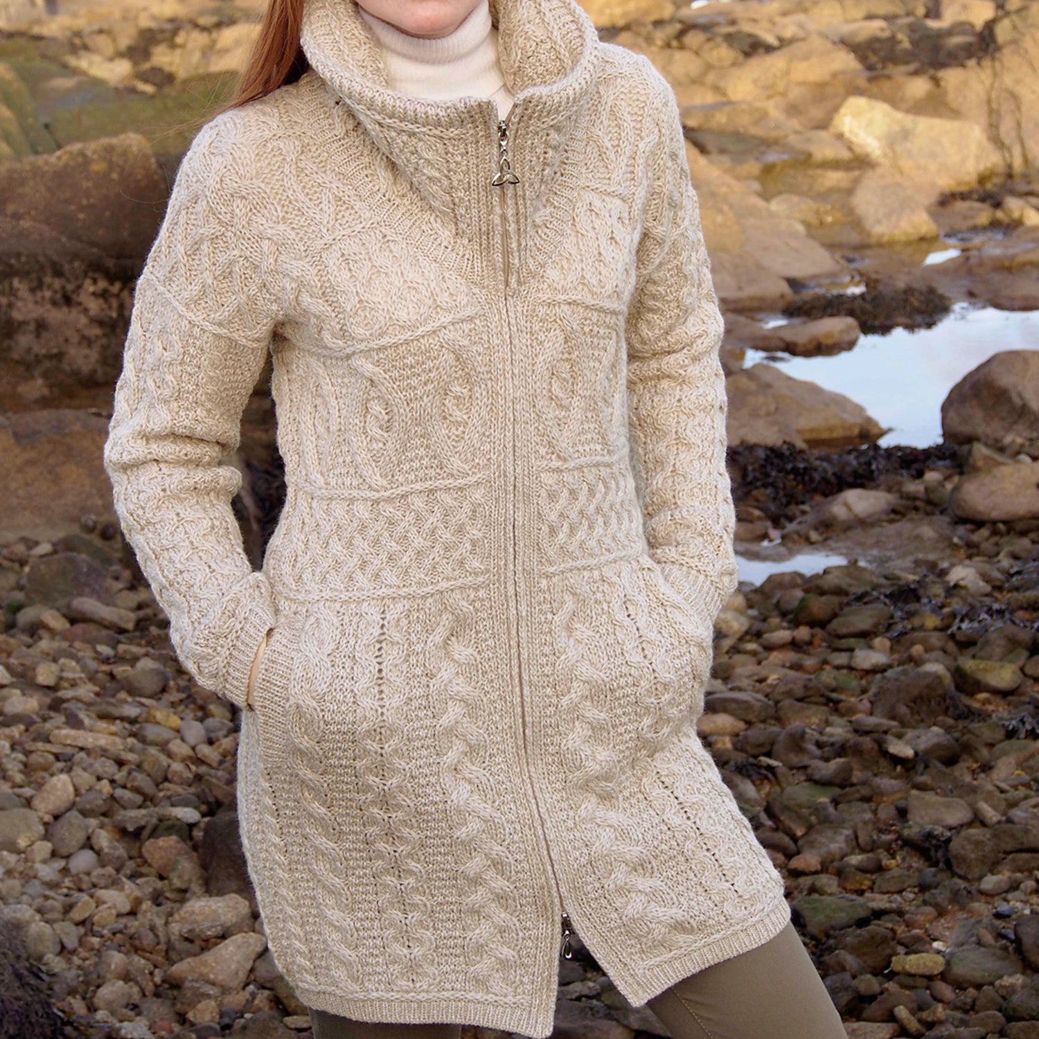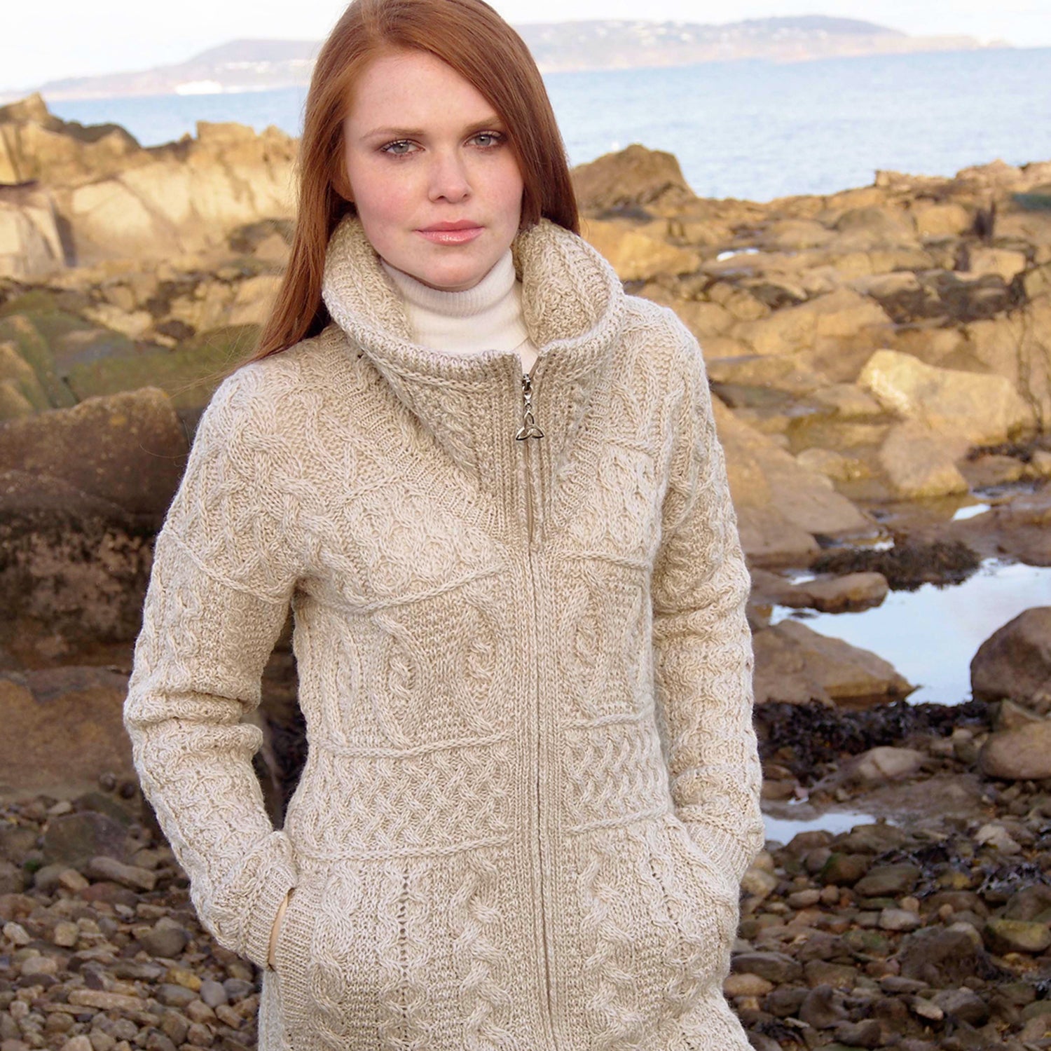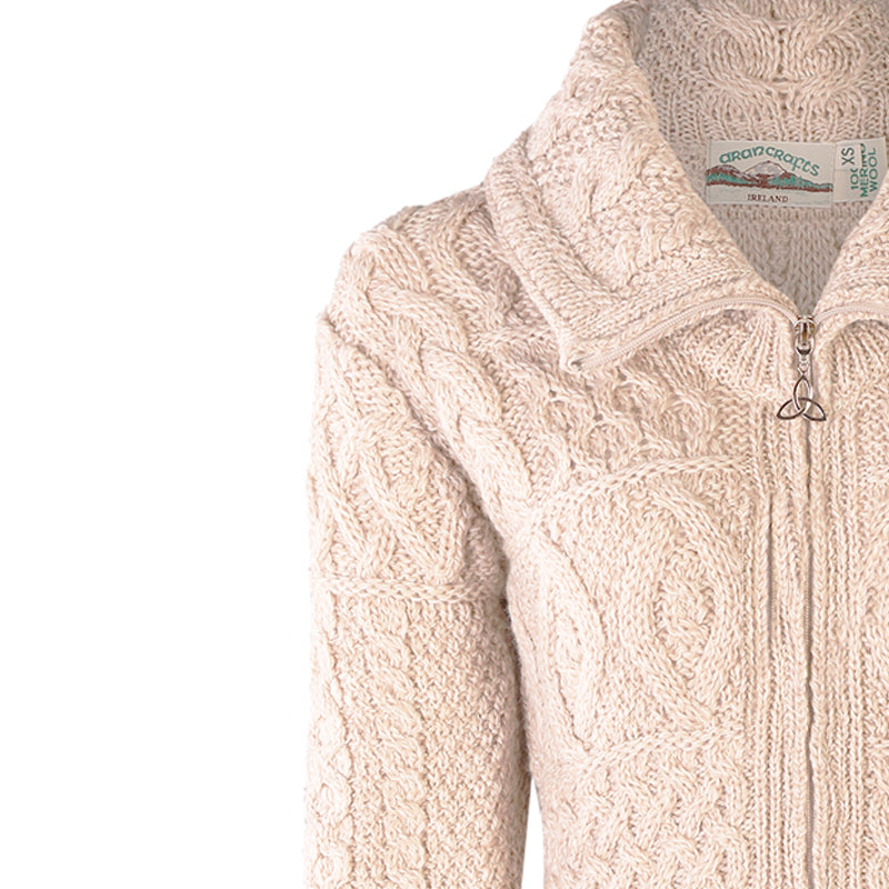 The double ended zip and pockets at the front of this Irish cardigan make it a practical choice.
