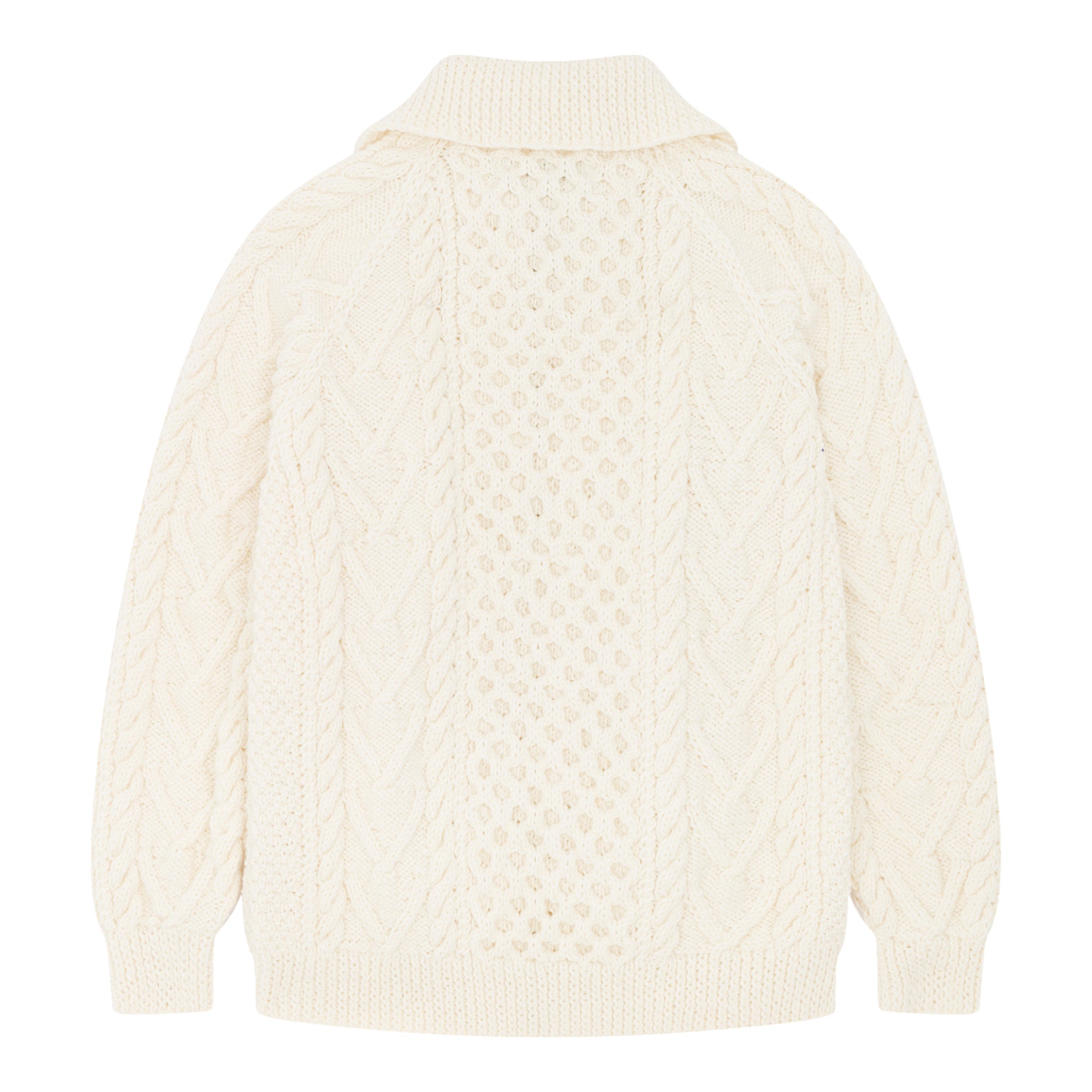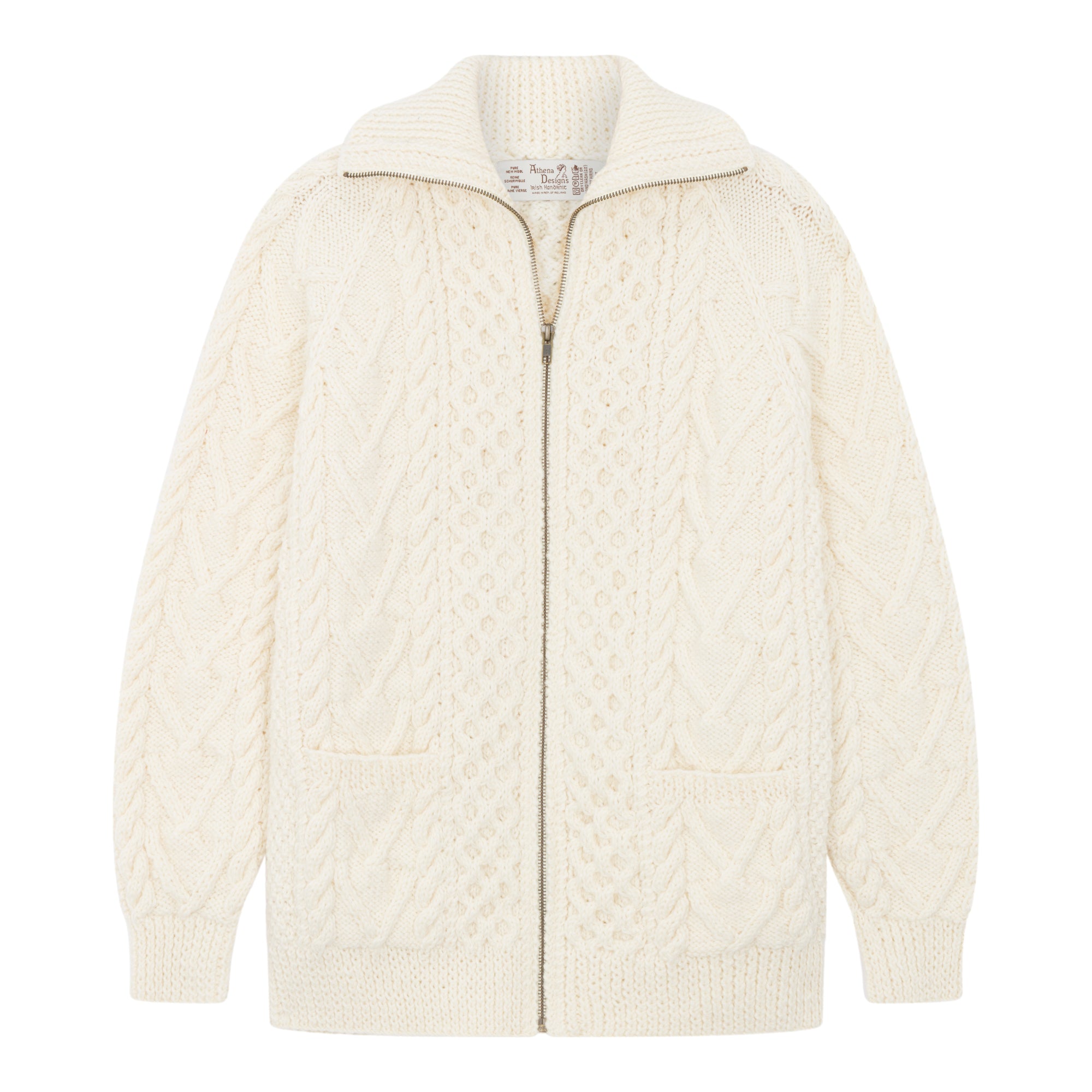 This traditional Irish zip sweater features intricate Aran patterns that pay homage to its rich heritage. This classic natural colour is a traditional staple. Ribbed detailing on the hem, neckline, and cuffs enhances its comfort and durability.