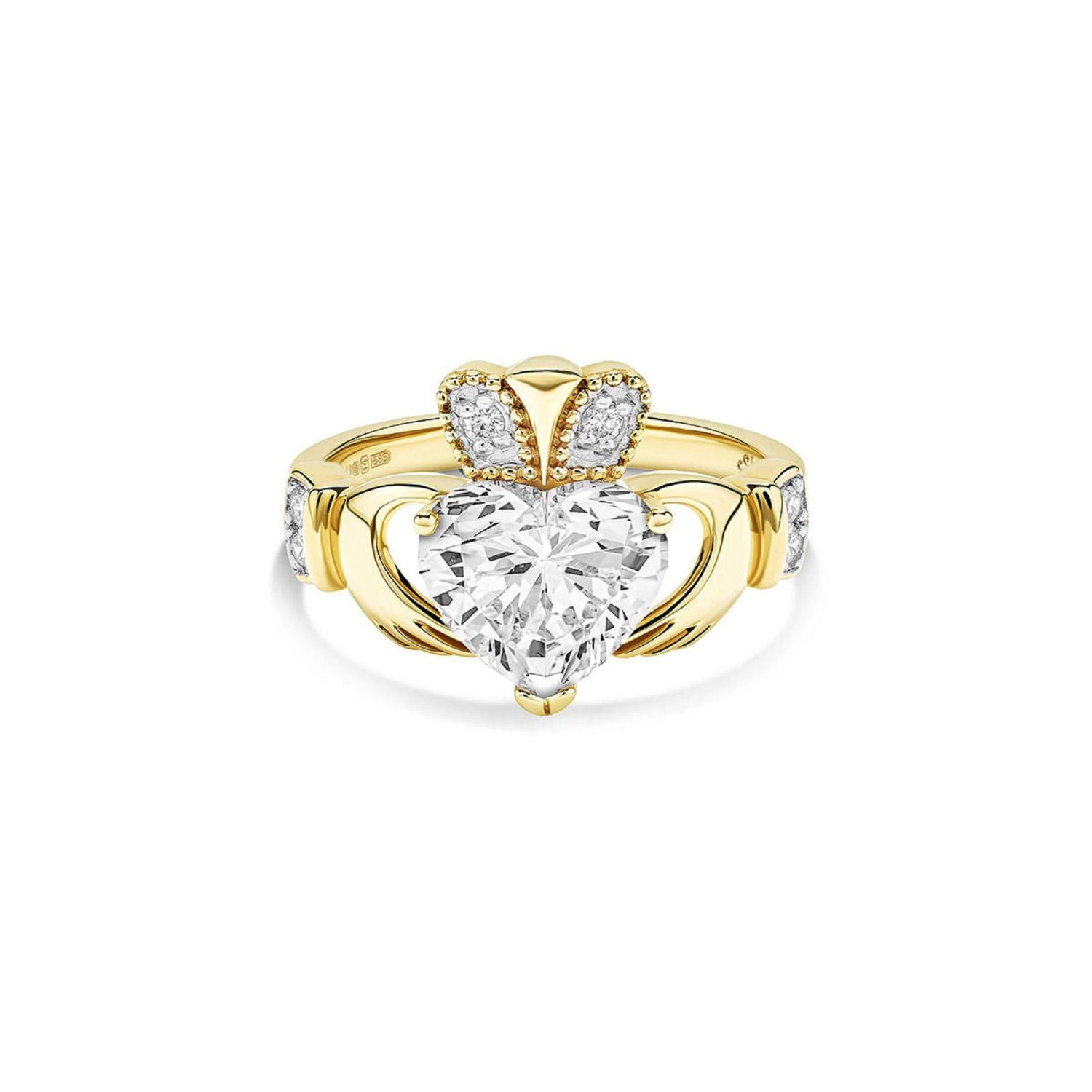 The iconic Claddagh motif—hands cradling a heart topped with a crown—is exquisitely rendered in polished 14K yellow gold, with delicate lab-grown diamond accents along the crown and band to enhance its sparkle.