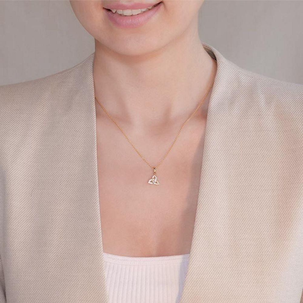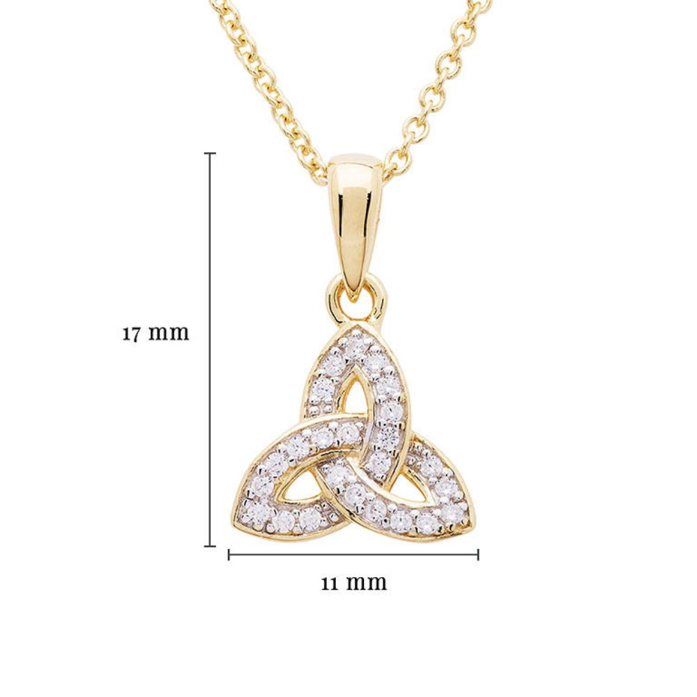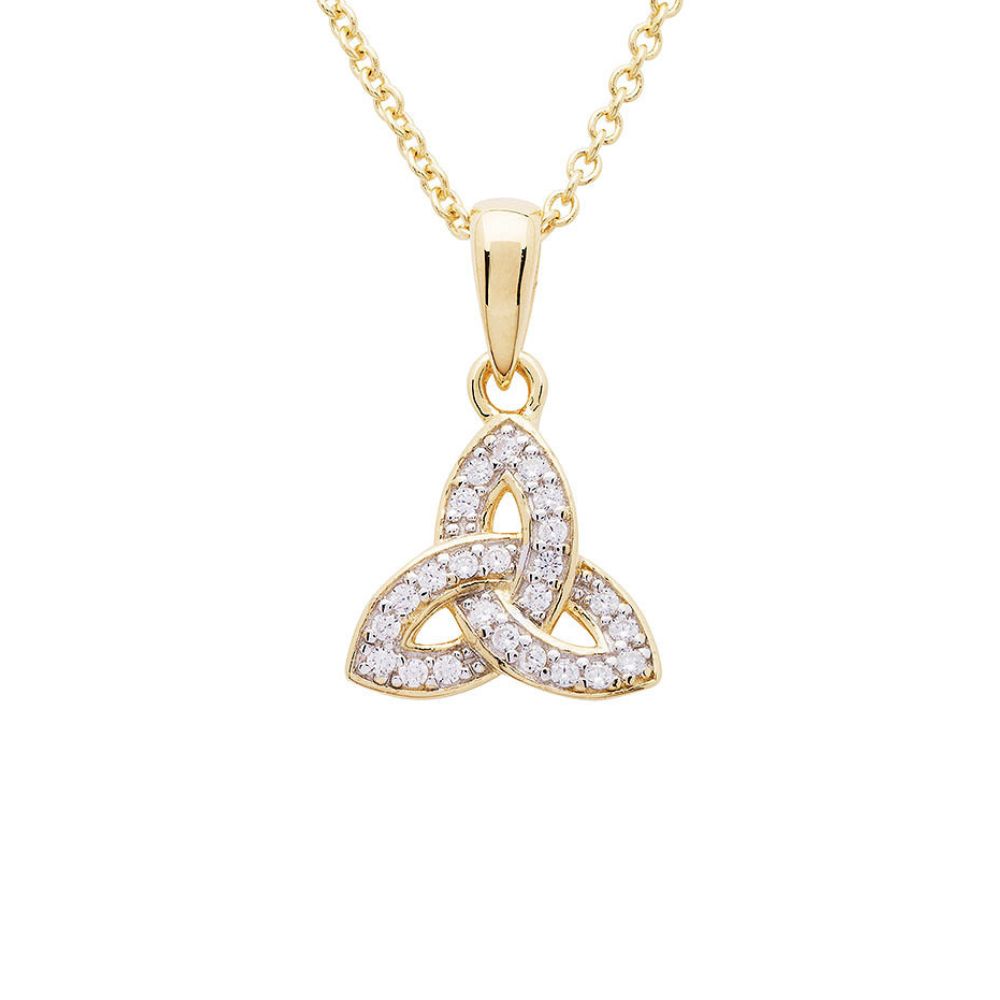 Crafted from Sterling Silver and coated in 14k Yellow Gold in Ireland, this trinity knot has been encrusted with stunning Cubic Zarconia.