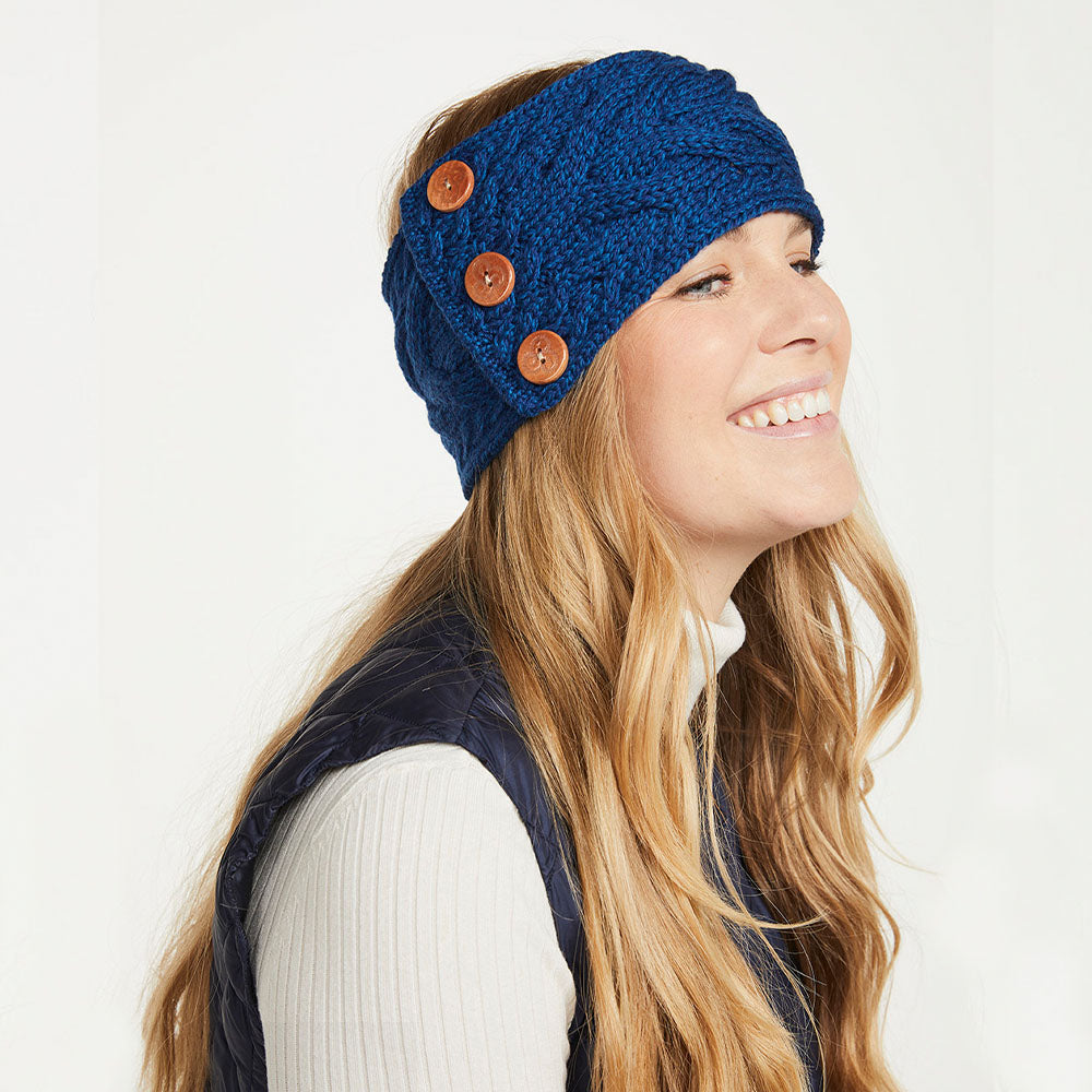 Blue Aran Knitted Headband with Buttons