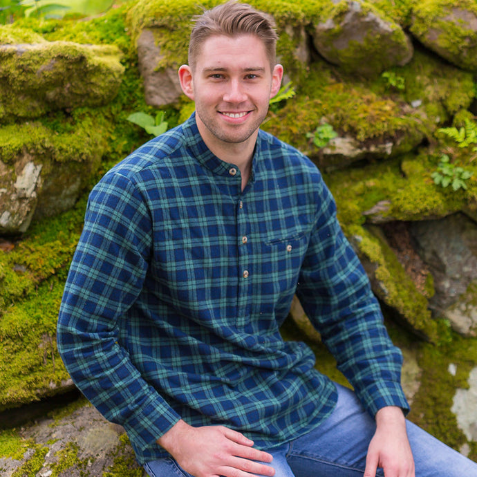 Navy & Green Check Cotton Grandfather Shirt