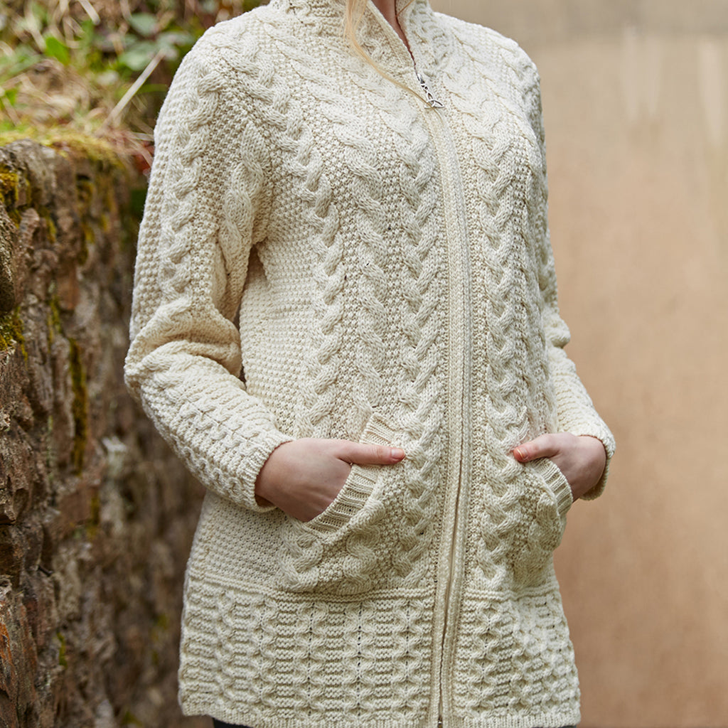 This long hooded zip cardigan is sure to attract attention due to it's intricate patterns that include cables and honeycomb, which is considered to be a symbol of luck.