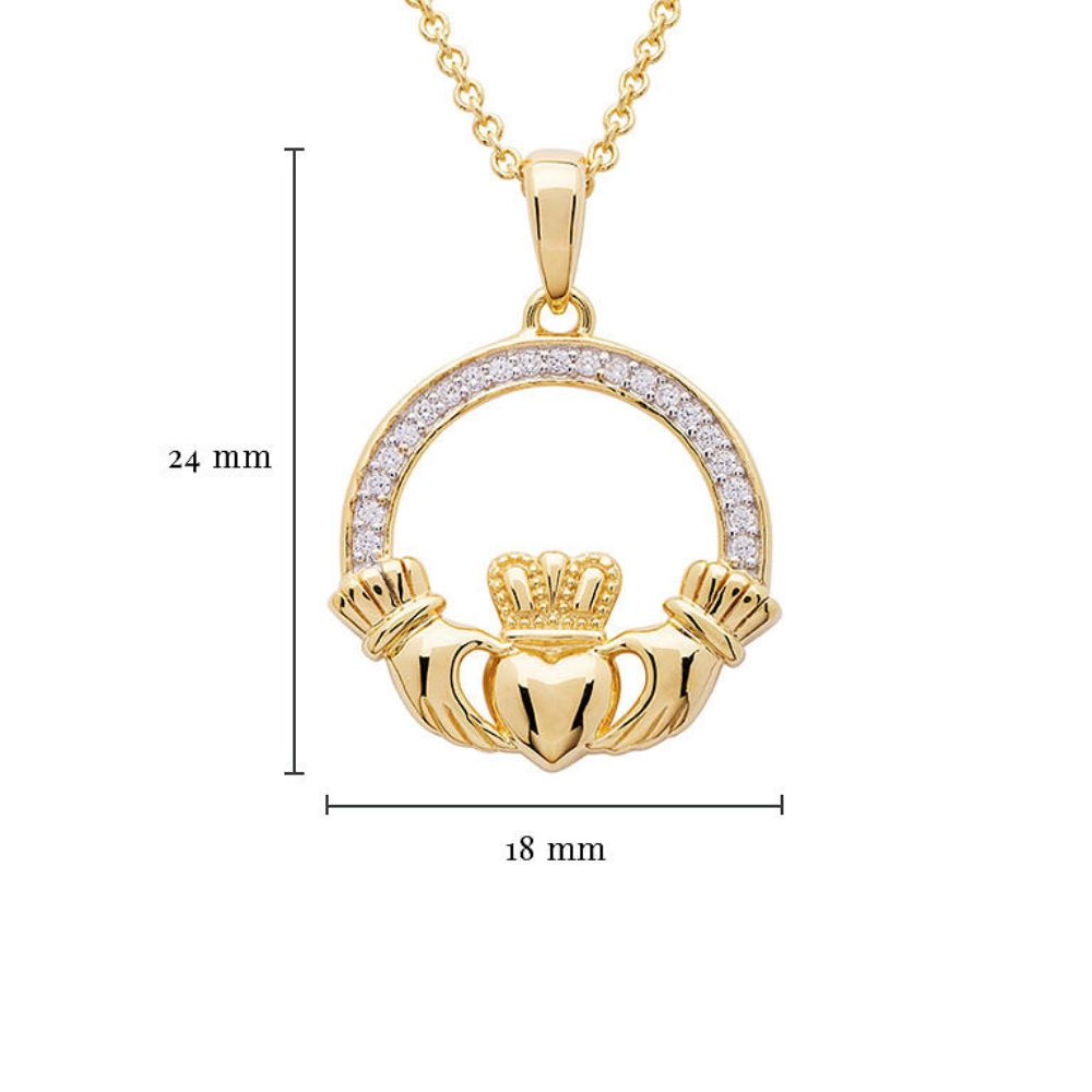 Crafted from Sterling Silver and coated in 14k Yellow Gold in Ireland, this claddagh necklace features a halo encrusted with stunning Cubic Zarconia.