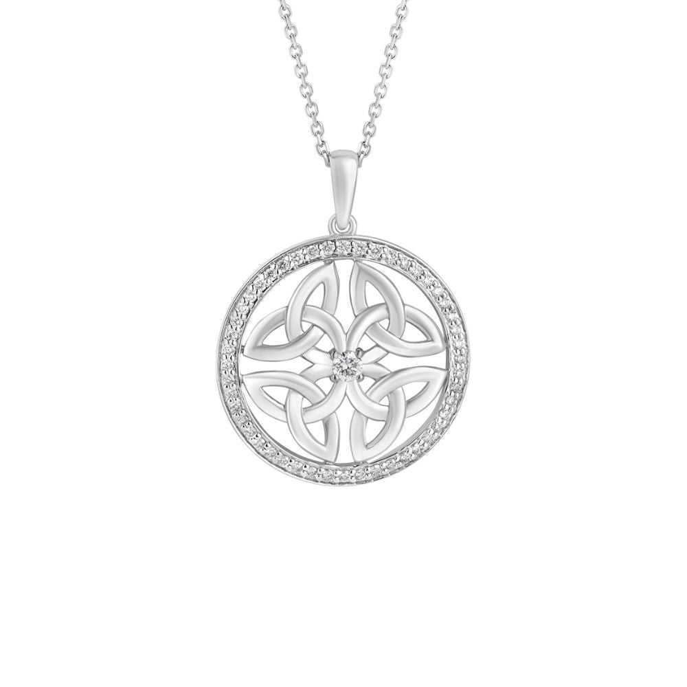 Crafted in radiant 14ct White Gold, this striking pendant features four intricately designed Trinity Knots—an enduring symbol of eternity, unity, and spiritual connection in Celtic tradition. At the heart of the piece, sparkling diamonds add brilliance and elegance.