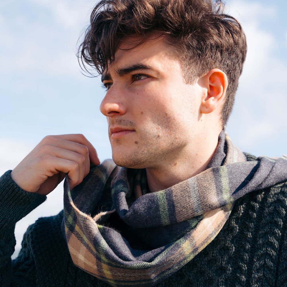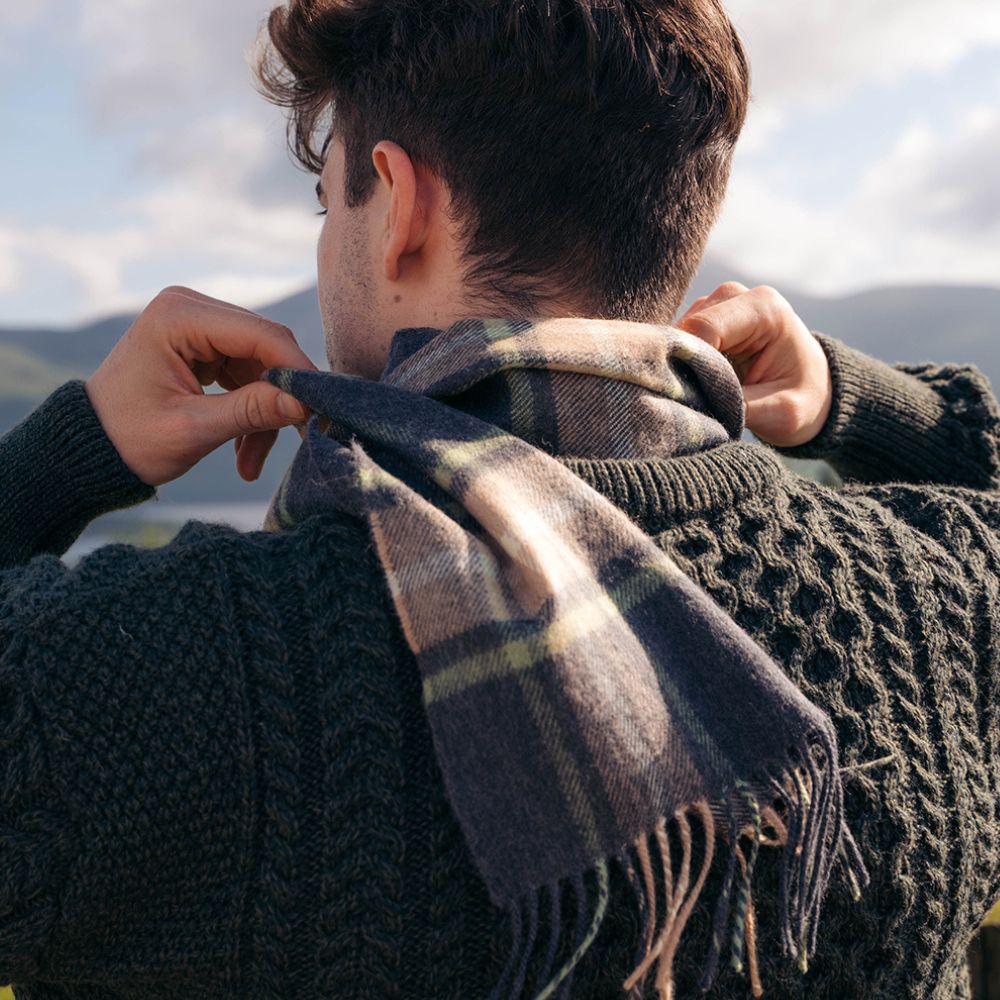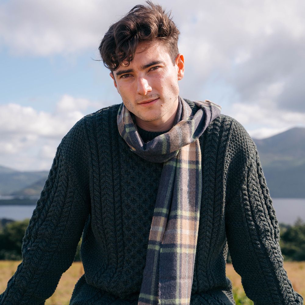 Grey Green Check Merino Wool Scarf