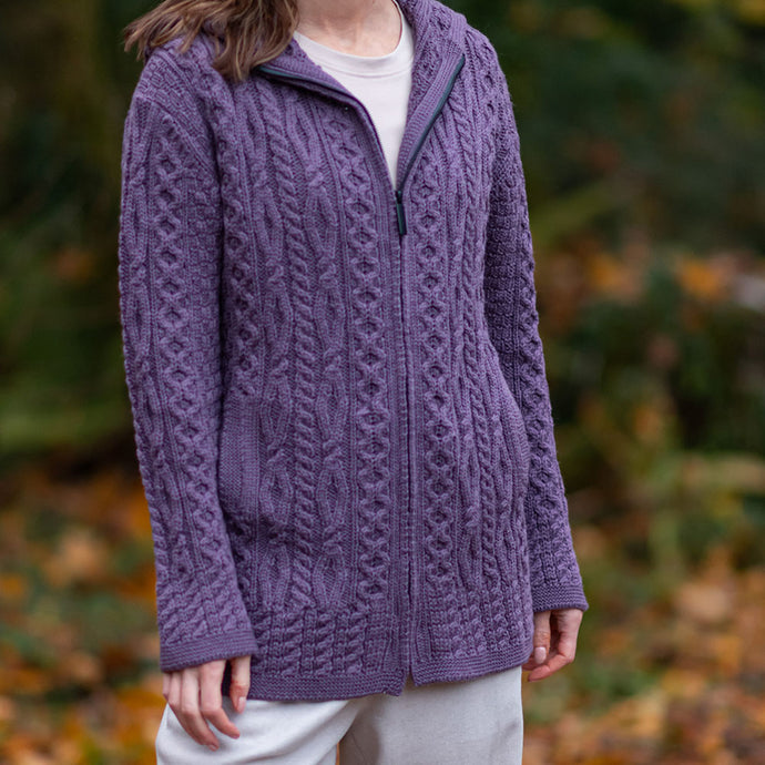 Lavender Siobhan Hooded Zip Aran Cardigan