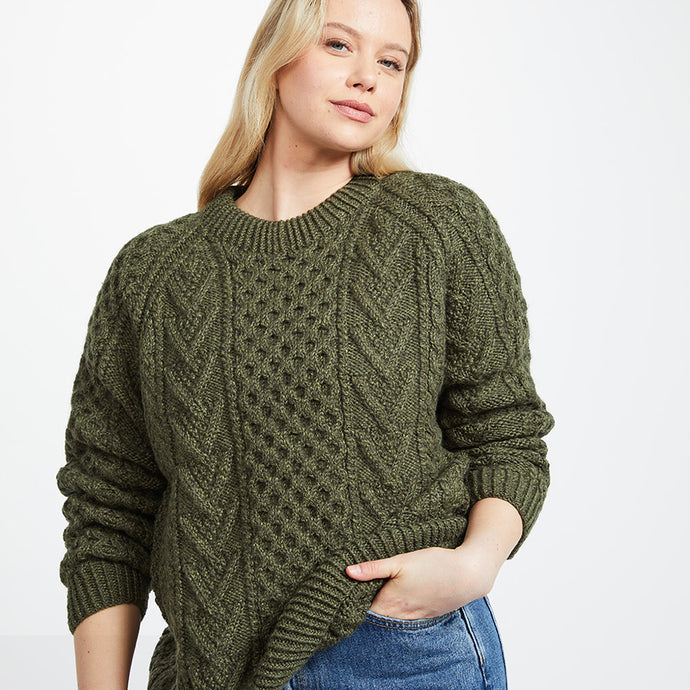 Army Green Unisex Crew Neck Aran Sweater