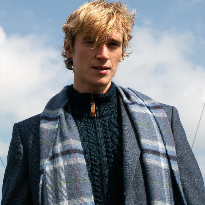 Merino & Cashmere Scarf, Blue & Grey Herringbone