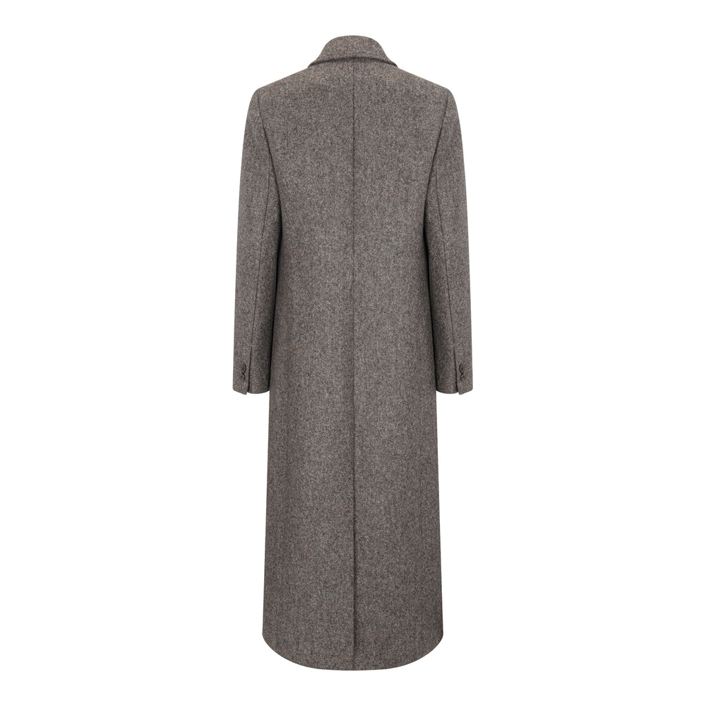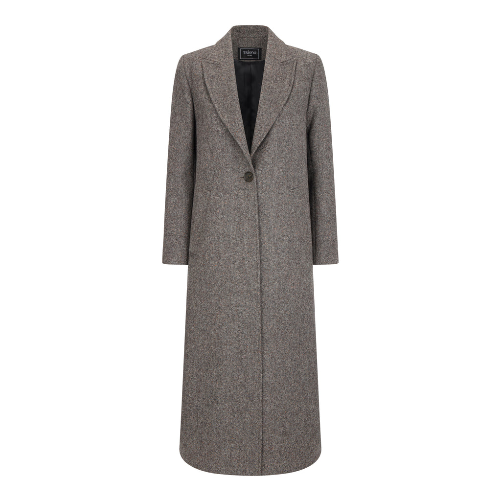 Designed to offer a sleek, tailored fit, the Shannon Tweed Coat’s full-length silhouette is complemented by a notched collar, structured shoulders, and a button-front closure, exuding understated sophistication with every detail.