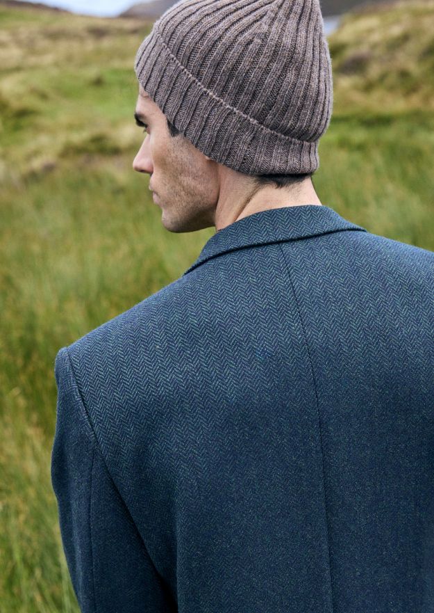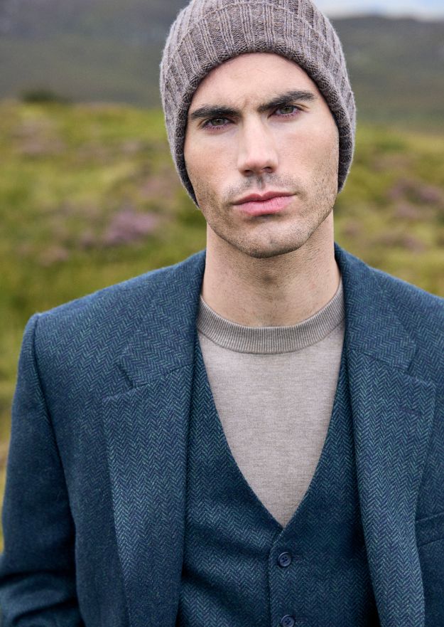 Introducing the Mushroom Herringbone Knitted Hat, a stunning accessory designed and made in Donegal by Fisherman Out of Ireland. This exquisite hat showcases a sophisticated herringbone knit pattern, crafted from a luxurious blend of merino and cashmere wool, ensuring unparalleled softness and warmth.