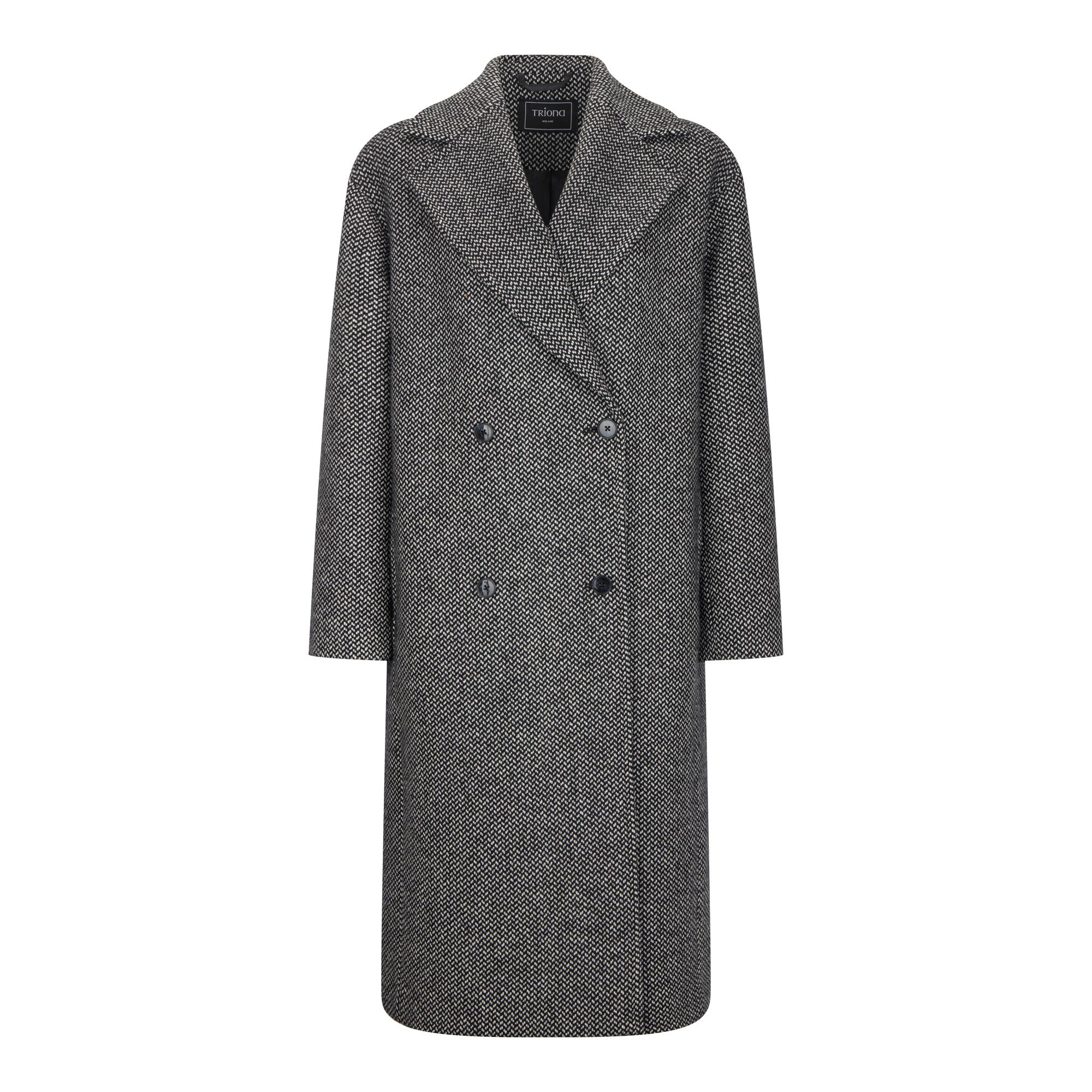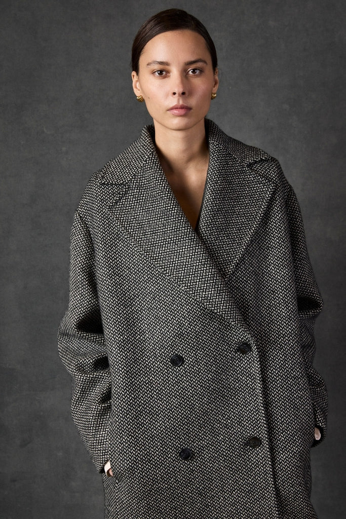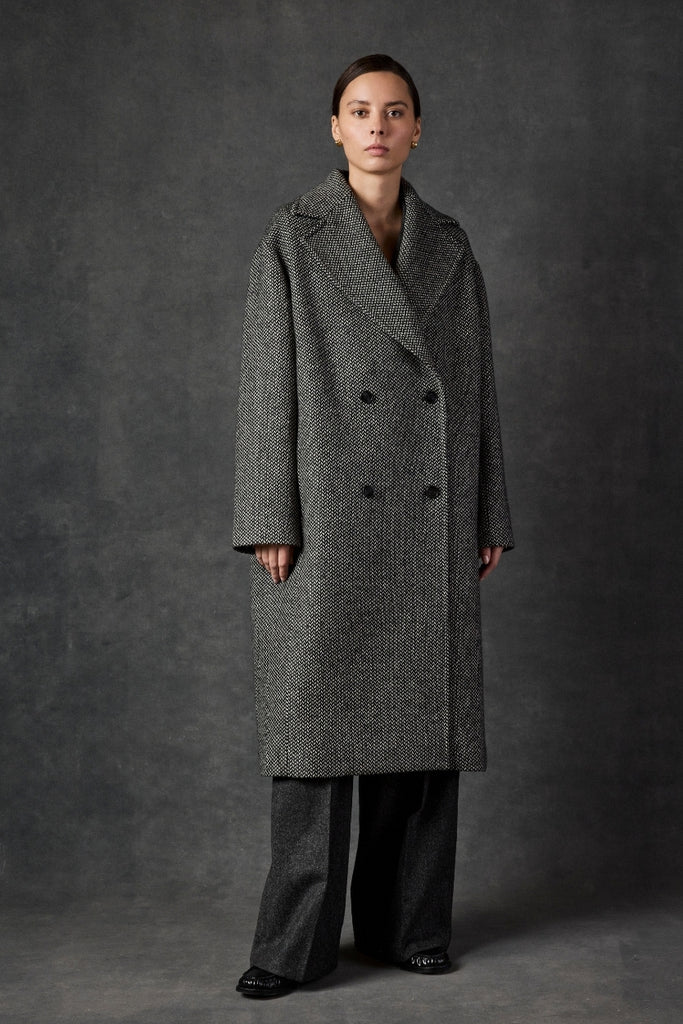 Cut in a timeless Black & White Broken Twill, the Ciara Coat is crafted from a luxurious merino and cashmere blend, offering a soft, warm feel with an elegant drape. The relaxed oversized fit and dropped shoulders create an effortlessly chic silhouette - perfect for layering over chunky knits as the temperature drops.
