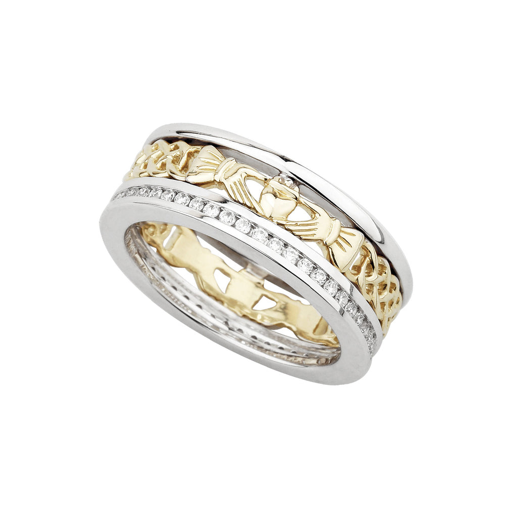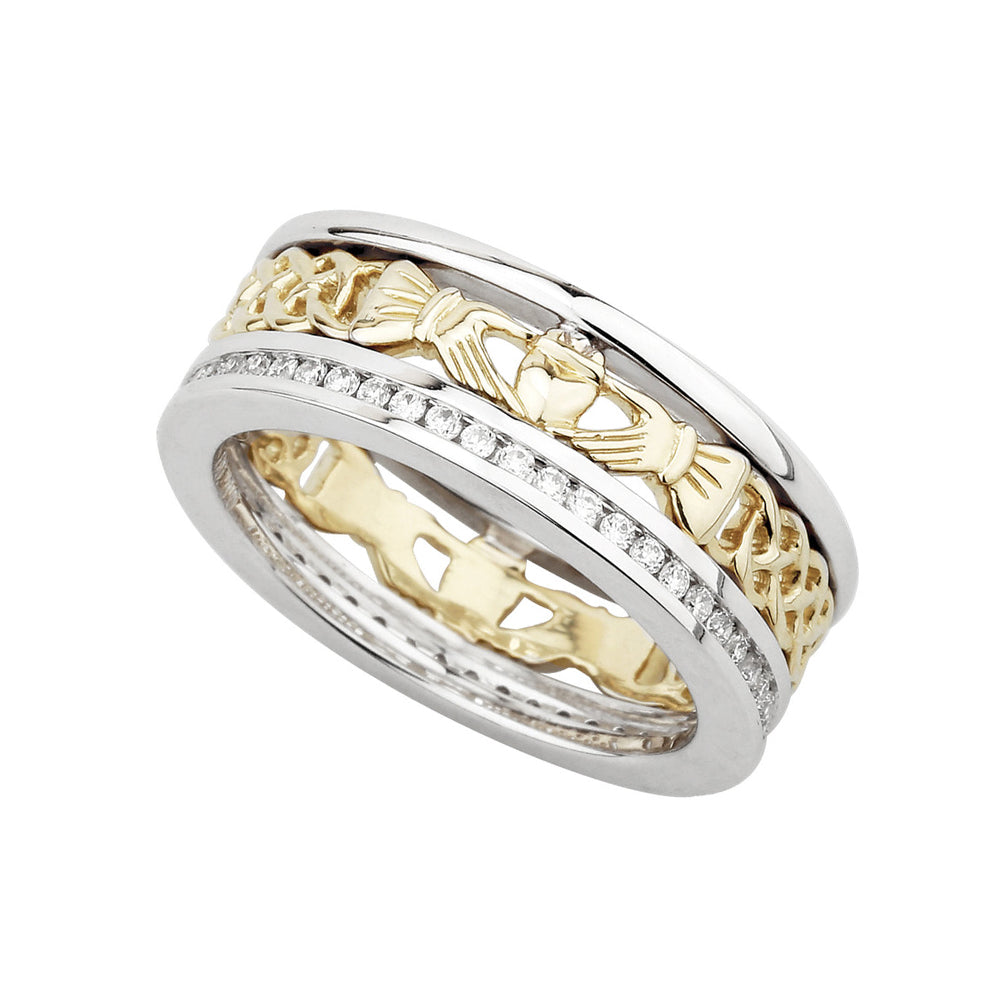 The White gold base of this eye catching Irish ring creates a unique contrast and brilliantly displays the celtic knot and claddagh design on this gorgeous unisex Claddagh ring.