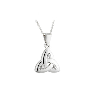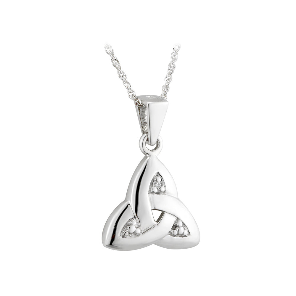 Three genuine diamonds adorn this delicate 14k white gold Trinity knot pendant.