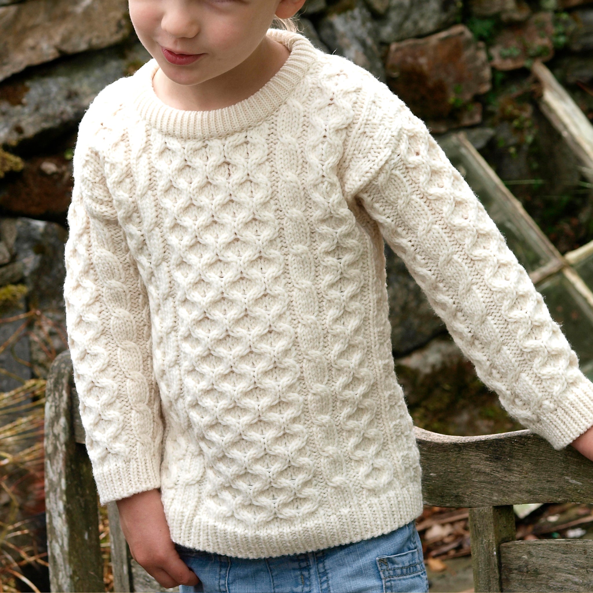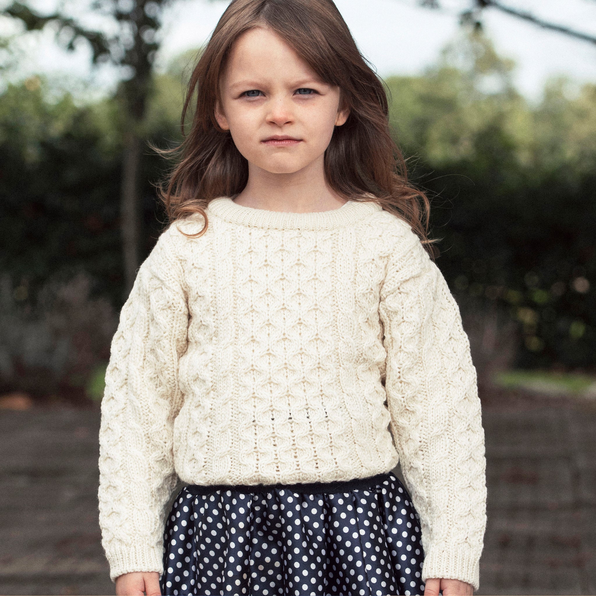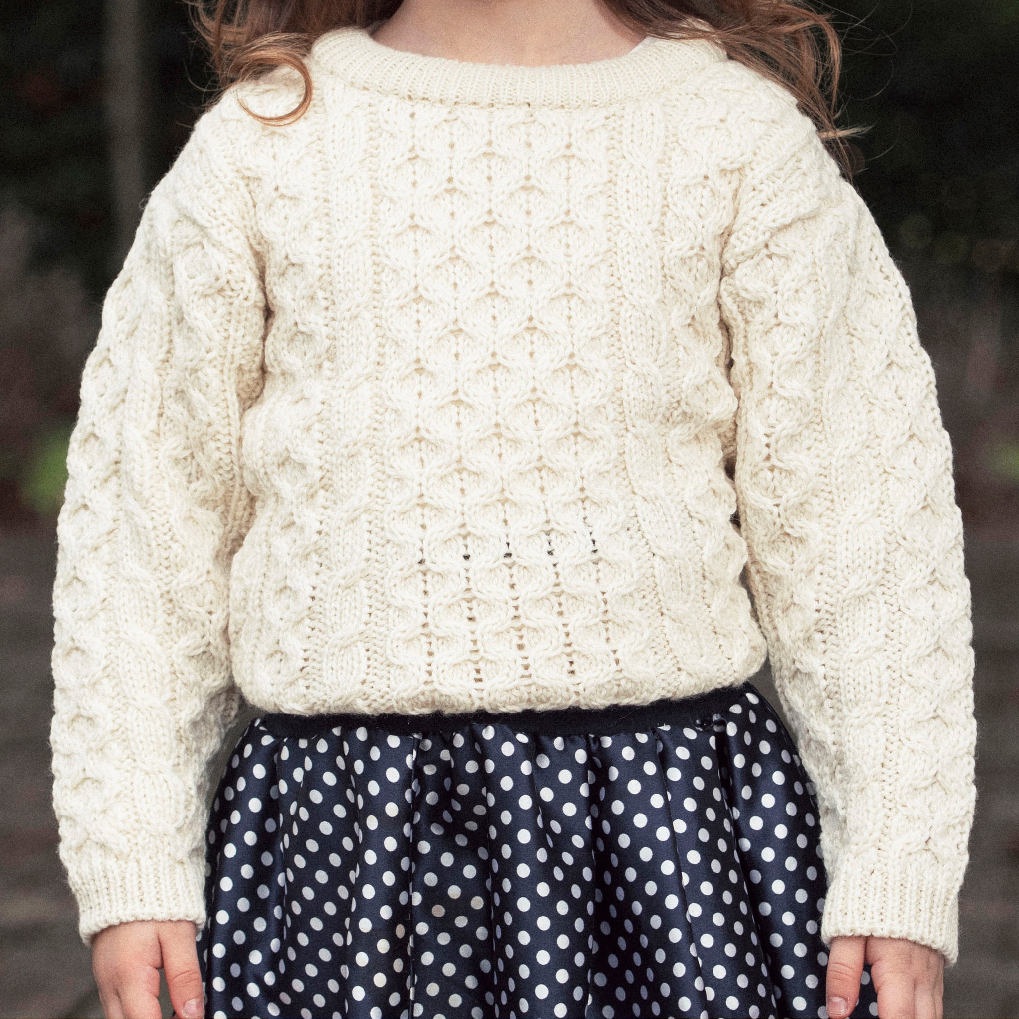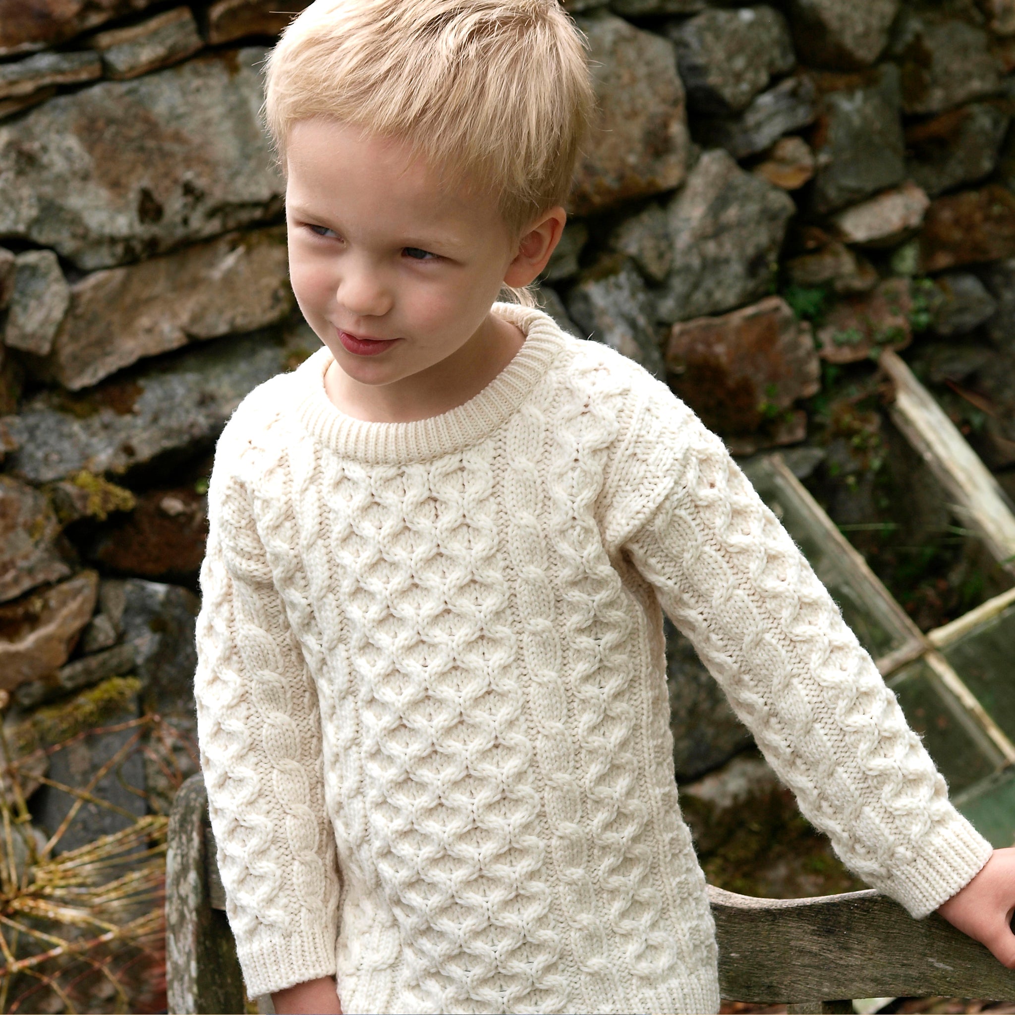 A honeycomb stitch Aran sweater in Natural white. This traditional sweater is a timeless classic and will add some heritage to your little ones wardrobe.